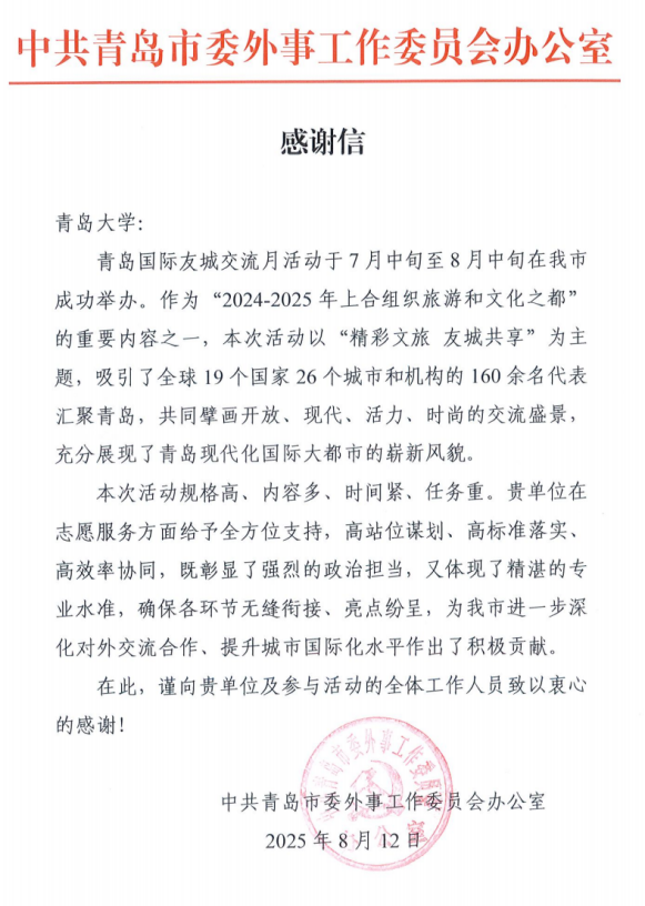 面对“规格高、内容多、时间紧、任务重”的挑战,外语学院志愿者们沉着冷静,以“高站位谋划、高标准落实、高效率协同”的专业素养,全程提供多语种翻译、会务协调、文化导览等服务,保障各环节无缝衔接,圆满完成了志愿服务任务,充分展现了青大学子良好的精神风貌和外语学院优秀的人才培养实力。青岛市人民政府外事办公室特致信青岛大学,对学校在志愿服务方面给予的全方位支持表示感谢,这封感谢信既是对青大志愿者工作的充分肯定,也是对外语学院长期以来服务地方外事的高度认可。