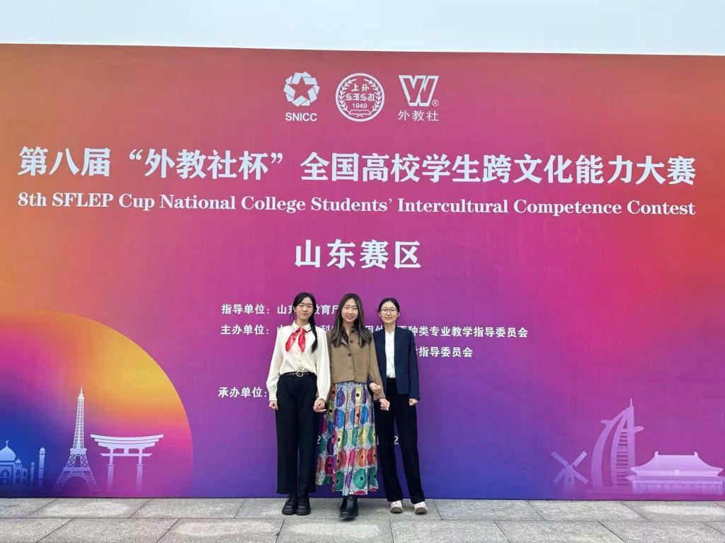 2025年10月24日-26日,第八届“外教社杯”全国高校学生跨文化能力大赛(山东省省赛)在山东师范大学顺利举行。由外语学院法语系学生李一林、英语系学生王文楚和医学院学生祝潇菡组成的青岛大学团队,凭借出色的跨文化沟通能力、扎实的专业素养与稳定的现场发挥,从众多优秀高校队伍中脱颖而出,勇夺山东省第一名,成功晋级全国总决赛。我院张群老师和公共外语学院秦丹雪老师、梁向真老师荣获优秀指导教师奖。