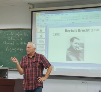 10月14日下午,青岛大学外语学院德语系前DAAD外籍专家、德国马丁·路德-哈勒-维滕贝格大学德语语言文学博士Detlef Gärtner应邀为德语系师生带来一场别开生面的诗歌工作坊。本次工作坊以20世纪德国戏剧理论家布莱希特(Bertolt Brecht)的诗歌创作为核心,选取Gärtner博士与青岛大学外语学院德语系团队合作编写的教材《含英咀华:德语诗歌诵读与赏析》中布莱希特的诗作“Vergnügungen”为例,探索诗人如何将平凡生活转化为饱含深意的诗歌。工作坊由德语系副主任王学博副教授主持,德语系主任綦甲福教授和研究生、本科生同学参加工作坊。