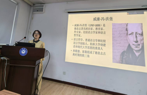 10月20日下午,青岛大学外语学院在博文楼312会议室举办外国语言文学系列学术讲座第195讲“朴素与忠实:洪堡的翻译思想”。本次讲座由同济大学赵劲教授主讲,德语系主任綦甲福教授主持。活动由外语学院和中德文化交流研究中心、教育部德语翻译课程虚拟教研室共同主办,德语系和歌德语言中心承办,山东省与德国交流合作研究中心、巴伐利亚研究中心协办。德语系教师和硕士研究生及本科生聆听讲座。