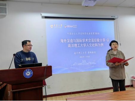 2025年11月28日下午,青岛大学外语学院在博文楼312室举行了“海外深造与国际学术交流经验分享——以南洋理工大学人文社科为例”和“国际学术期刊论文写作与发表”两场学术讲座。讲座特邀新加坡南洋理工大学中文系崔峰教授担任主讲,外语学院院长卞建华主持,学院各系教师及学生共同参与。