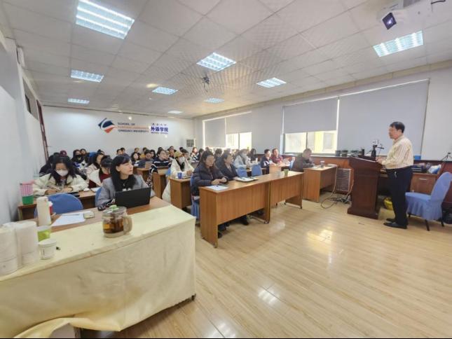 12月4日下午,青岛大学外语学院在浮山校区博文楼312会议室举办硕士研究生导师培训暨外国语言文学系列学术讲座第202讲——“译学为导、译术为要,精准翻译,讲好中国故事研究”。本次讲座由吉林外国语大学高级翻译学院谢旭升教授主讲,学院副院长曹杉主持。学院院长卞建华、德语系主任綦甲福等2025级MTI研究生及导师参加了讲座。