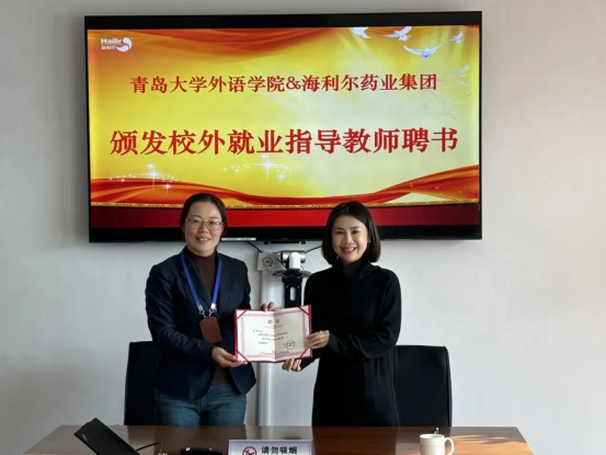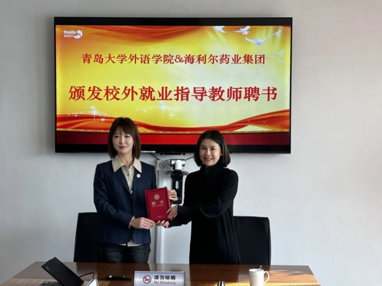 双方在校企合作交流会上围绕深化协同育人机制展开深入探讨。海利尔药业集团股份有限公司外贸部部长牛玉玲介绍了公司的人才需求岗位与技能要求。于苗详细介绍了外语学院的专业设置、课程特色及人才培养方向等。经过充分沟通,双方在毕业生就业精准对接方面达成初步合作意向,并签署“人才培养基地”协议。于苗代表学院向乔茜、牛玉玲颁发校外就业导师聘书,标志着校企合作迈入新阶段。未来,双方将依托资源整合与优势互补,共建多样化实习实践平台,为学生拓展更广阔的成长与发展空间。