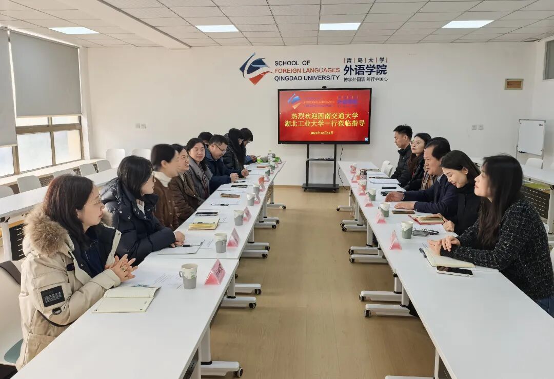 12月12日下午,西南交通大学外国语学院党委书记李成坚、党委副书记兼纪委书记李芹、团委书记张茜、组织员郭炳君,湖北工业大学外国语学院副院长黄广芳、李池利,英语系党支部书记张涛、英语系主任刘艳、骨干教师刘凌一行到我院开展调研交流。青岛大学外语学院党委书记陈崇研、院长卞建华、党委副书记于苗、英语系副主任石灿,以及辅导员刘浩、夏淼参加座谈。座谈会由陈崇研主持。