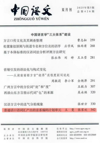 近日,我院王曼教授团队在汉语语言学领域一级权威期刊《中国语文》发表题为“普通话口语词汇产出的音系编码计划单元”的研究论文。王曼教授为第一作者和通讯作者,硕士研究生张家欢为第二作者,青岛大学为第一作者单位。