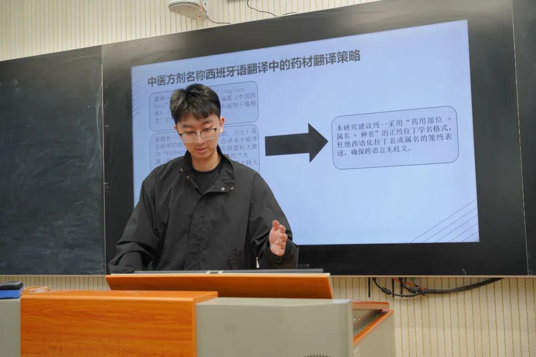 10月25日,2025年“麓山语言与文化”本科生论坛在湖南师范大学外国语学院腾龙楼613报告厅举行。在我院教师王斐的指导下,西班牙语系2022级学生张赟睿的论文“生态翻译学视域下《金匮要略》方剂名西班牙语翻译探讨”荣获一等奖。