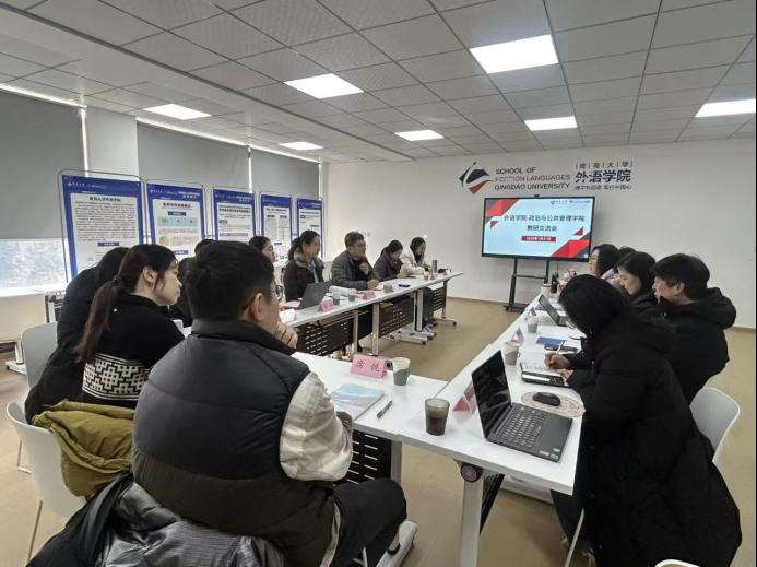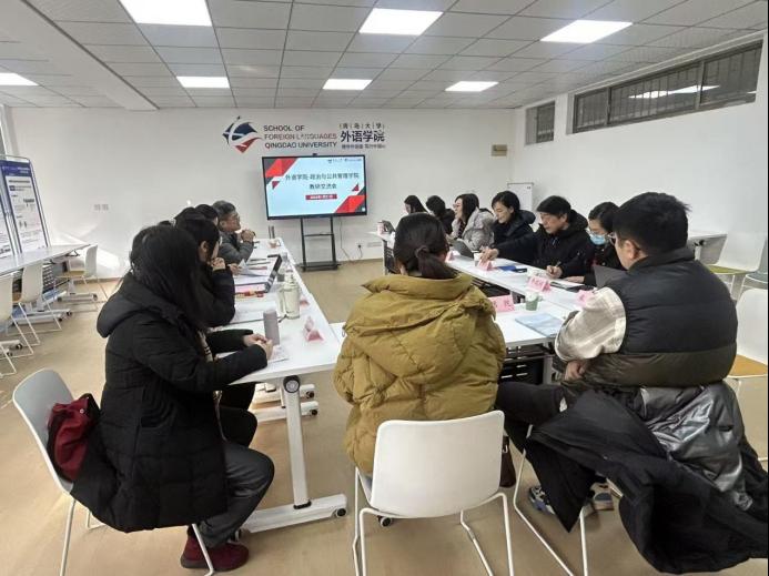 2026年1月21日上午,外语学院、政治与公共管理学院联合召开教研交流会。两院相关领导、骨干教师代表齐聚一堂,围绕跨院课程共建、后续教学规划及区域国别学学科建设等核心议题深入研讨,凝聚协同育人共识,推动学科深度融合与高质量发展。会议由外语学院王薇教授组织并主持。政治与公共管理学院学院副院长王猛、韩庆娜,外语学院副院长布占廷、曹杉以及两院骨干教师共同出席本次会议。
