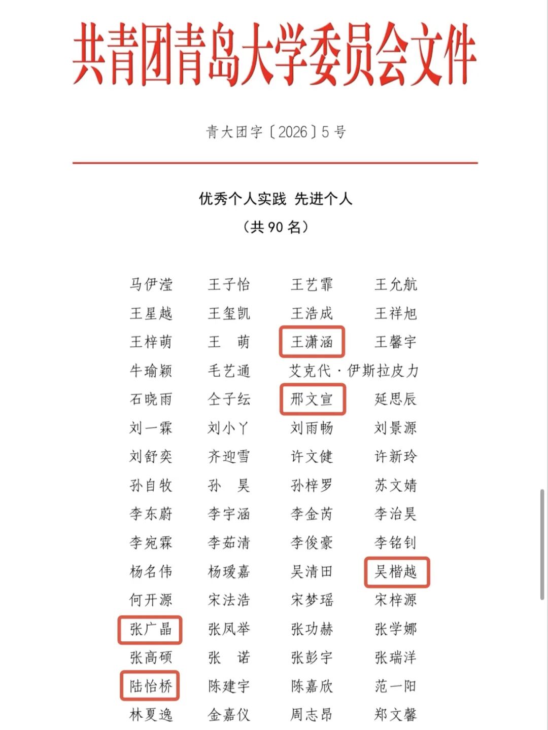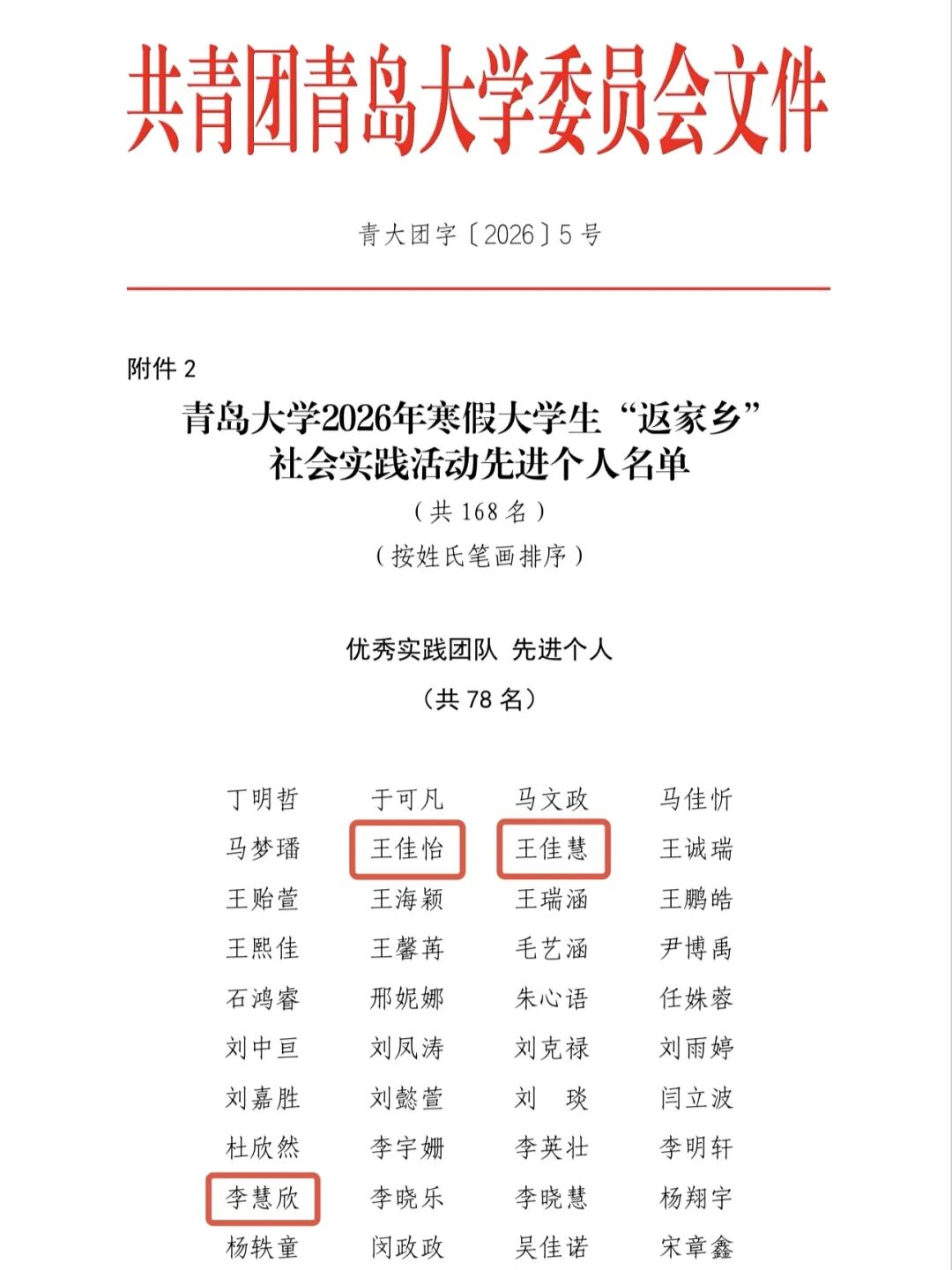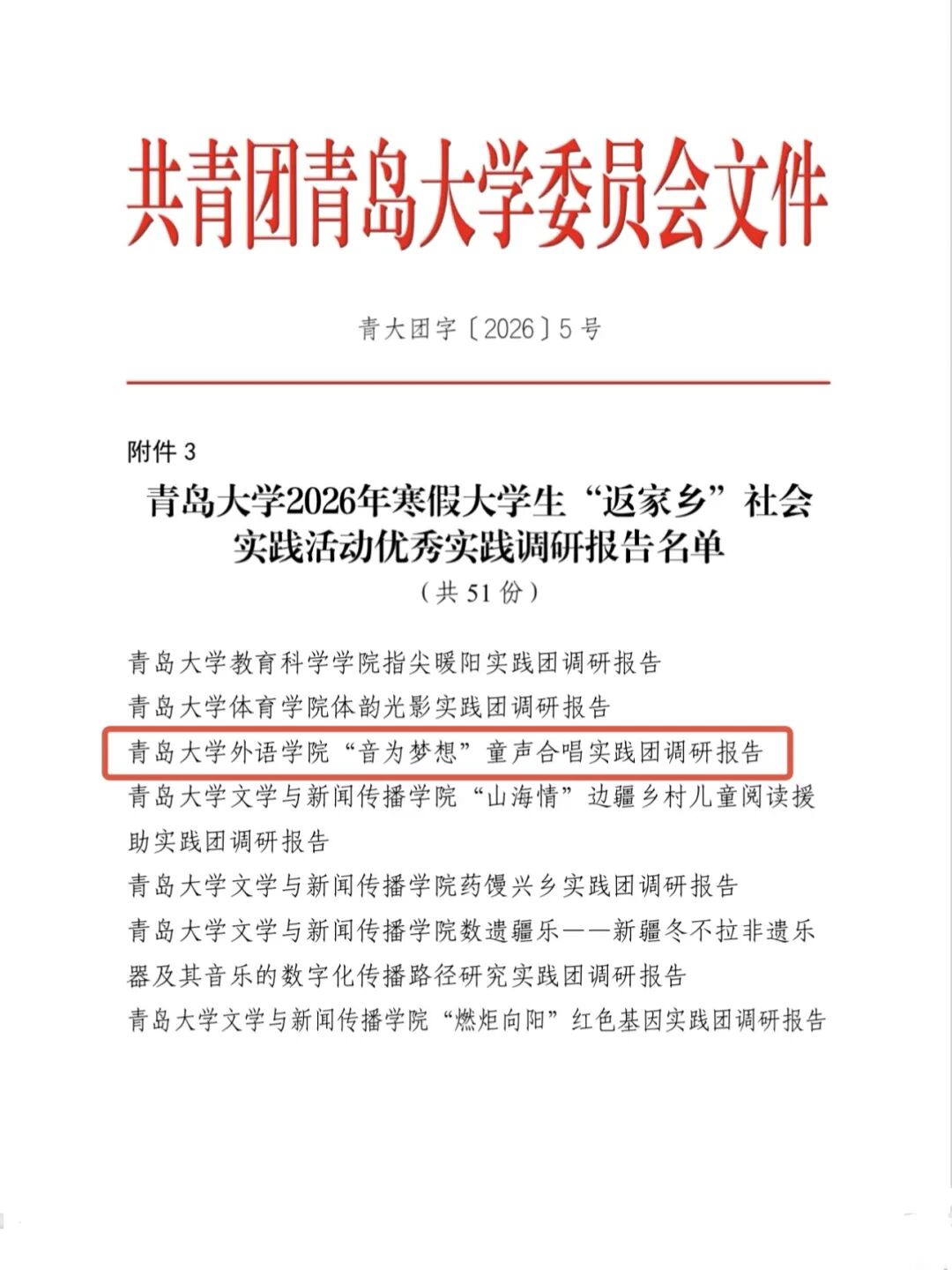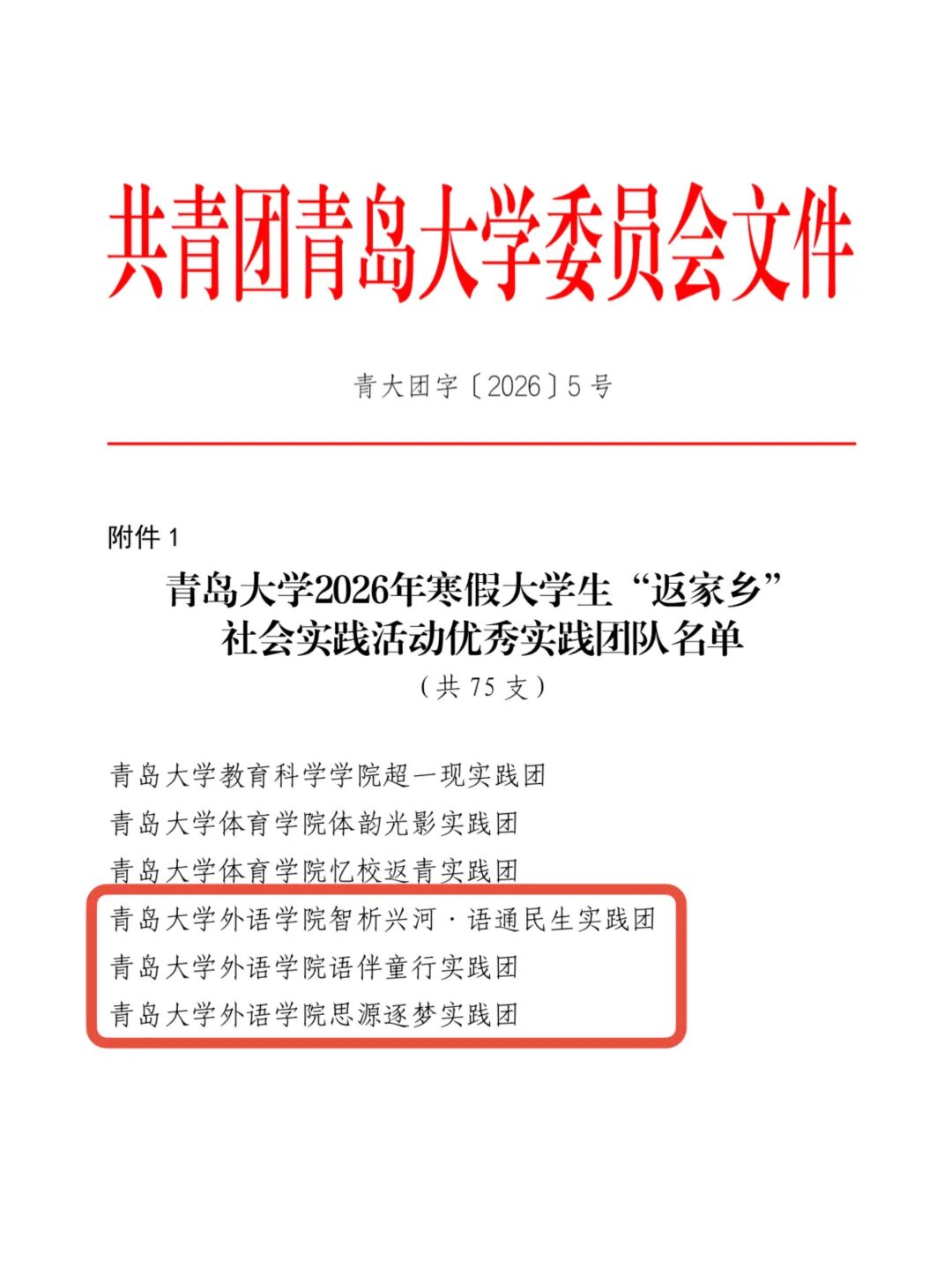 近日,“青春为中国式现代化挺膺担当”青岛大学2026年寒假大学生“返家乡”社会实践活动先进集体与个人评选结果正式公布。我院学子踊跃参与、扎根家乡基层一线,在实践中展现出良好风貌与过硬本领,获评优秀实践团队3支、优秀实践调研报告1项,另有8名同学荣获先进个人称号。